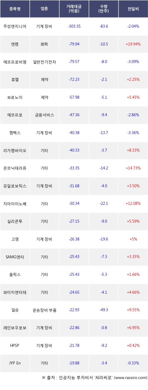 외국인 투자자의 순매도 상위 20개 종목은 주성엔지니어링, 엔켐, 에코프로비엠, 휴젤, 보로노이, 에코프로, 젬백스, 리가켐바이오, 온코닉테라퓨틱스, 유일로보틱스등이다.