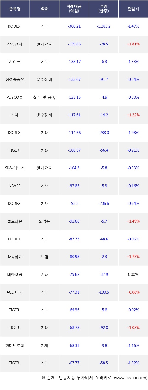 기관 투자자의 순매도 상위 20개 종목은 KODEX 200선물인버스2X, 삼성전자, 하이브, 삼성중공업, POSCO홀딩스, 기아, KODEX 코스닥150선물인버스, TIGER 미국S&P500, SK하이닉스, NAVER등이다.