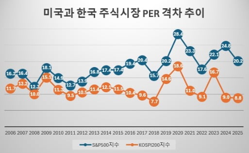 같은 순이익을 내는 두 기업이 있다고 가정하자. A 기업은 주당 순이익이 1,000원일 때 주가가 2만 원이고, B 기업은 주당 순이익이 동일해도 주가가 9천 원에 불과하다. A가 미국, B가 한국이라고 보면 된다. 특히 한국과 미국의 PER 격차는 작년 말 기준으로는 지난 20년 중 가장 크게 벌어져 있었다.