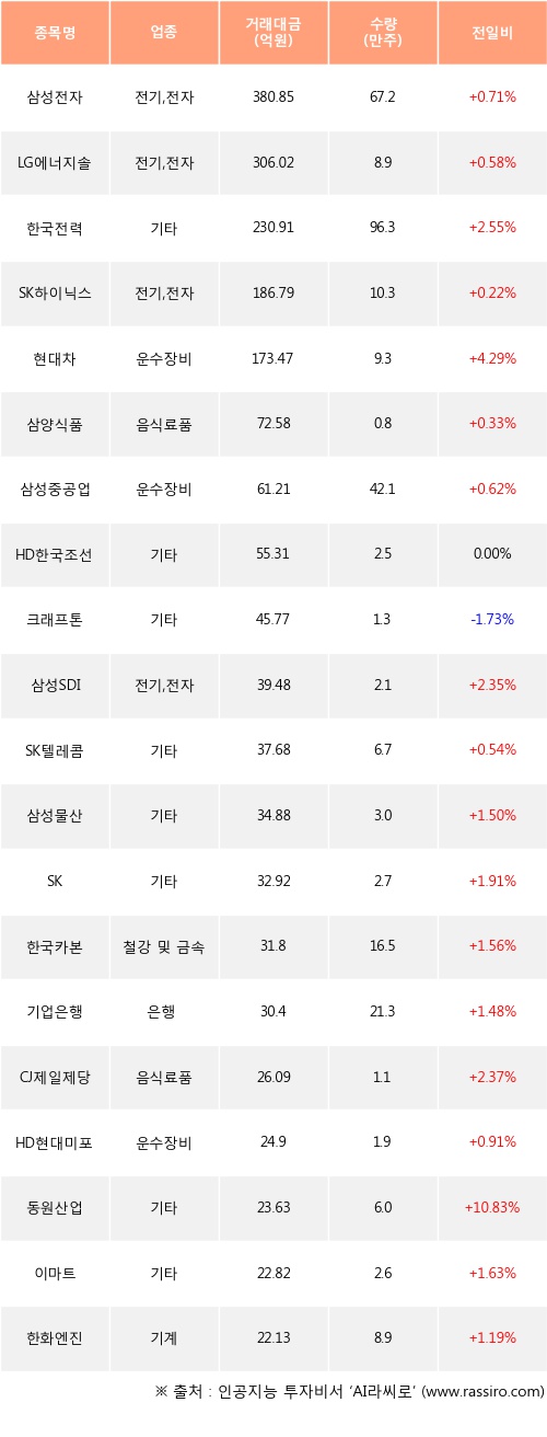외국인 투자자의 순매수 상위 20개 종목은 삼성전자, LG에너지솔루션, 한국전력, SK하이닉스, 현대차, 삼양식품, 삼성중공업, HD한국조선해양, 크래프톤, 삼성SDI등이다.