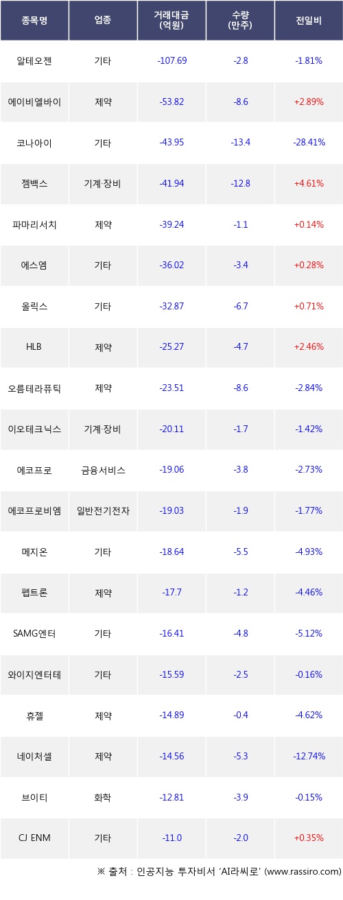 기관 투자자의 순매도 상위 20개 종목은 알테오젠, 에이비엘바이오, 코나아이, 젬백스, 파마리서치, 에스엠, 올릭스, HLB, 오름테라퓨틱, 이오테크닉스등이다.