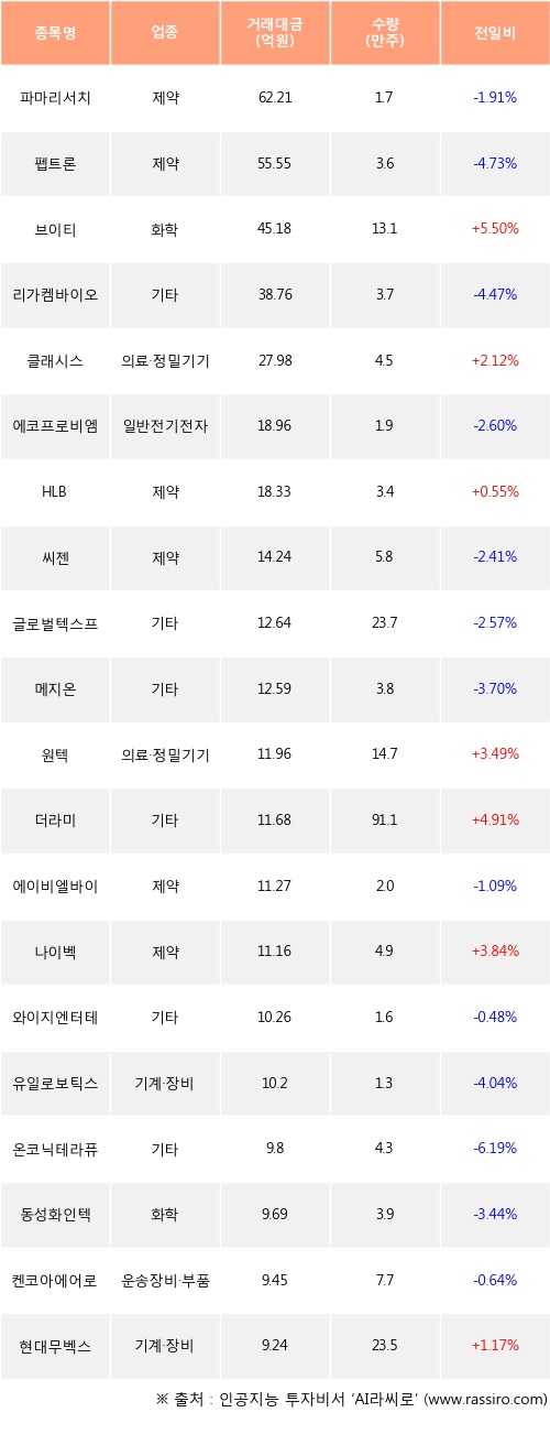 브이티, 클래시스, HLB 등은 전일 대비 주가가 상승했고, 파마리서치, 펩트론, 리가켐바이오 등은 주가가 하락했다.