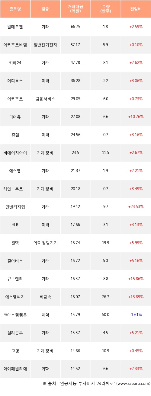 기관 투자자의 순매수 상위 20개 종목은 알테오젠, 에코프로비엠, 카페24, 메디톡스, 에코프로, 디어유, 휴젤, 비에이치아이, 에스엠, 레인보우로보틱스등이다.
