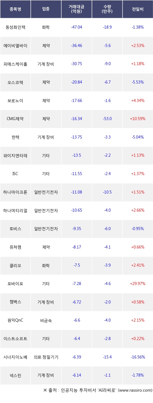 기관 투자자의 순매도 상위 20개 종목은 동성화인텍, 에이비엘바이오, 피에스케이홀딩스, 오스코텍, 보로노이, CMG제약, 한텍, 와이지엔터테인먼트, ISC, 하나마이크론등이다.