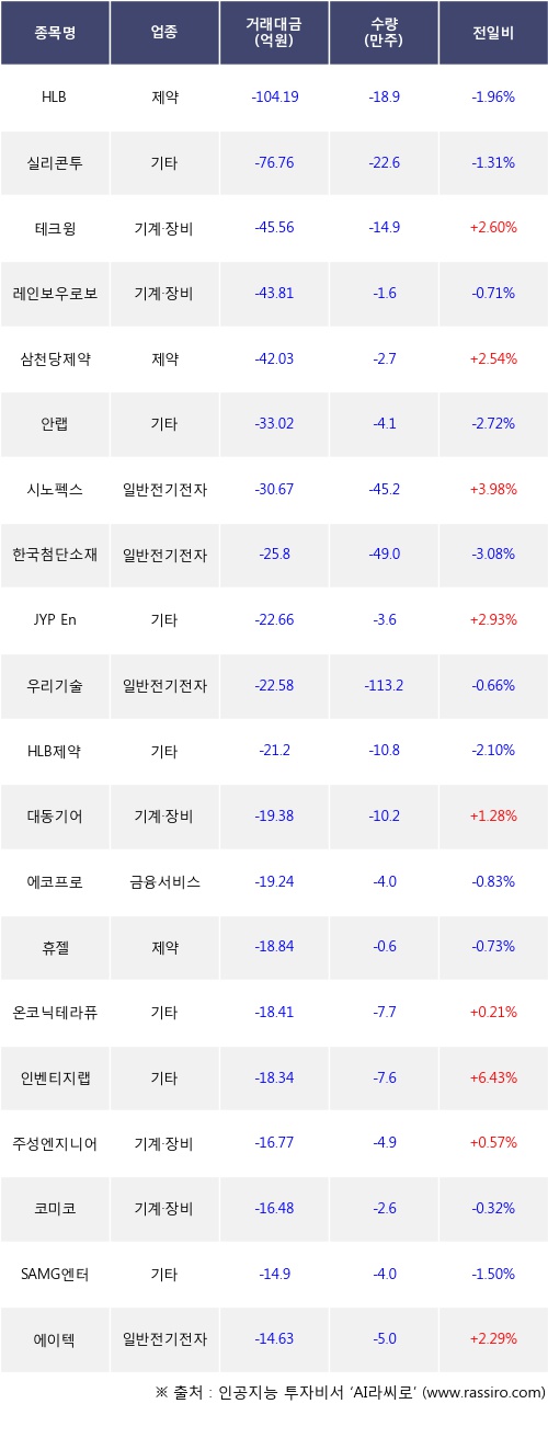 외국인 투자자의 순매도 상위 20개 종목은 HLB, 실리콘투, 테크윙, 레인보우로보틱스, 삼천당제약, 안랩, 시노펙스, 한국첨단소재, JYP Ent., 우리기술등이다.