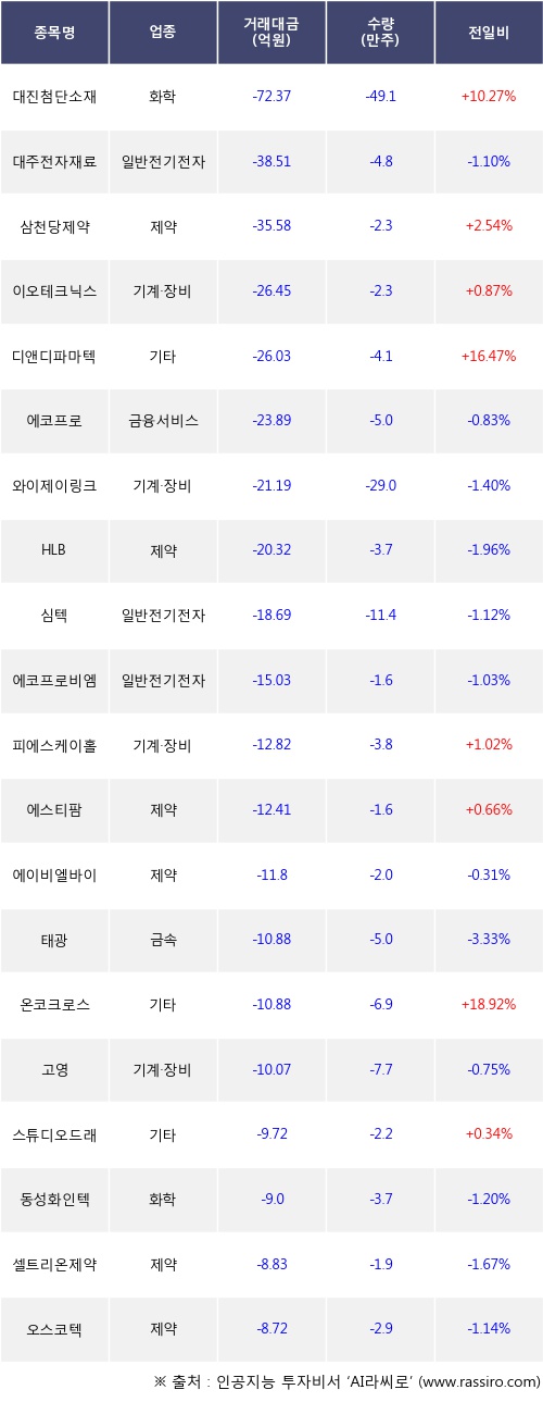 기관 투자자의 순매도 상위 20개 종목은 대진첨단소재, 대주전자재료, 삼천당제약, 이오테크닉스, 디앤디파마텍, 에코프로, 와이제이링크, HLB, 심텍, 에코프로비엠등이다.