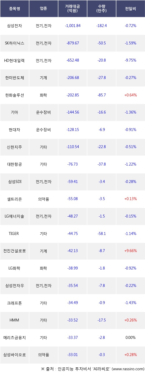 외국인 투자자의 순매도 상위 20개 종목은 삼성전자, SK하이닉스, HD현대일렉트릭, 한미반도체, 한화솔루션, 기아, 현대차, 신한지주, 대한항공, 삼성SDI등이다.