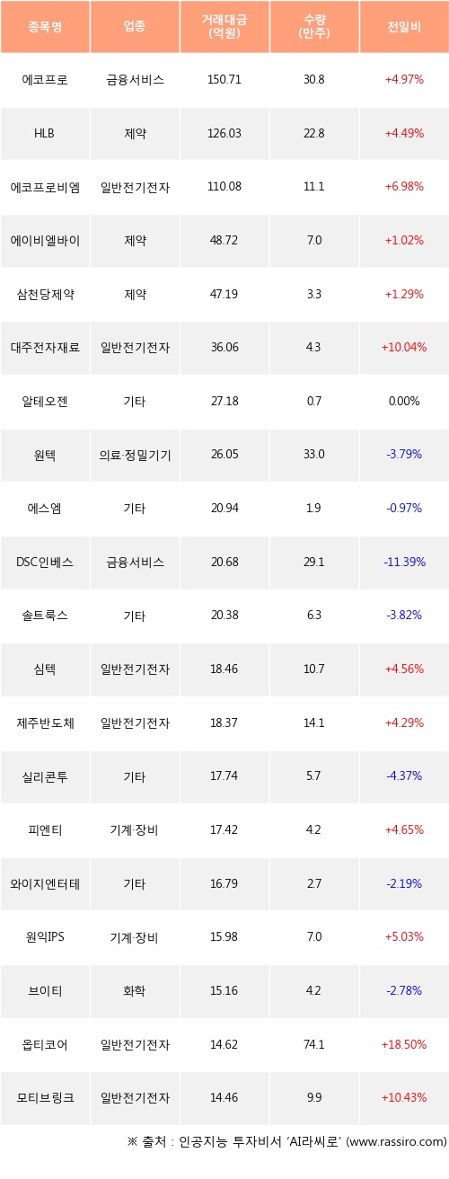 외국인 투자자의 순매수 상위 20개 종목은 에코프로, HLB, 에코프로비엠, 에이비엘바이오, 삼천당제약, 대주전자재료, 알테오젠, 원텍, 에스엠, DSC인베스트먼트등이다.