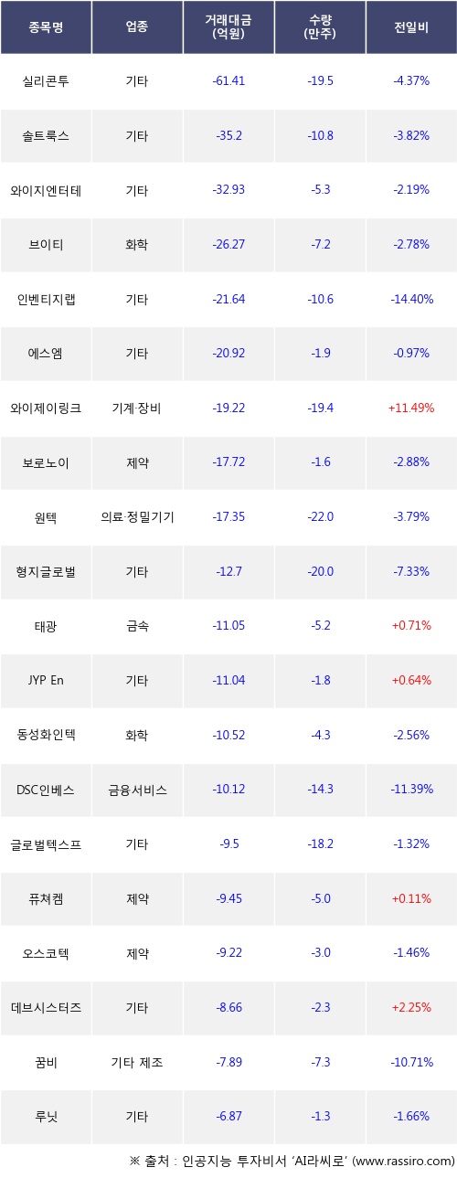 기관 투자자의 순매도 상위 20개 종목은 실리콘투, 솔트룩스, 와이지엔터테인먼트, 브이티, 인벤티지랩, 에스엠, 와이제이링크, 보로노이, 원텍, 형지글로벌등이다.