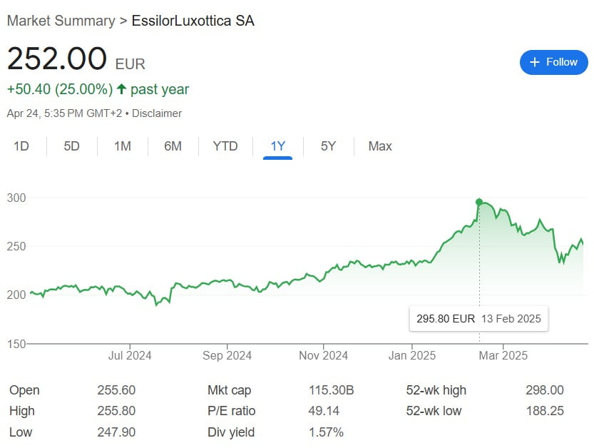 유로넥스트 파리에 상장된 에실로룩소티카의 주가는 지난 24일 252유로에 마감했습니다. 올들어 7.6% 상승했습니다. 관세 충격으로 조정받은 주가는 조금씩 회복하는 추세입니다.
