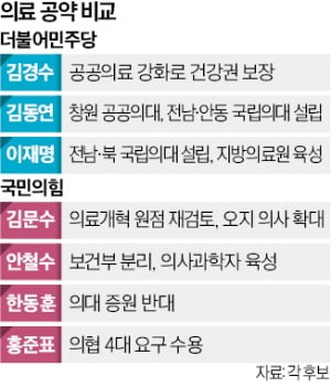 25일 한국경제신문이 후보자들의 의료 관련 정책을 분석한 결과 민주당 후보들은 일제히 공공의대 설립을 주장했다. 이재명 후보는 지난 24일 SNS를 통해 “전남과 전북에 국립의대를 설립해 공공의료 인력을 양성하겠다”고 밝혔다. 전북엔 폐교된 서남대 의대 정원을 활용하고, 전남엔 공공의대를 신설하는 방안이 검토되는 것으로 알려졌다.20일엔 “공공의대를 설립해 공공·필수·지역 의료 인력을 양성하고, 디지털 인프라를 기반으로 한 차세대 공공의료 시스템을 갖춘 공공병원을 확충하겠다”고 밝히기도 했다. 김동연 후보는 경남 창원에 공공의대를, 경북 안동과 전남에 국립의대를 설립하겠다고 밝혔다. 김경수 후보도 “전남에 국립의대를 신설하겠다”고 했다.