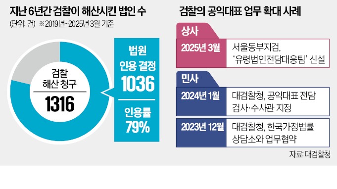 검찰이 ‘기소와 수사’라는 전통적 업무 영역을 넘어 ‘공익대표자’ 활동을 대폭 확대하고 있다. 유령법인 해산부터 친권상실 청구까지 공익을 위한 민사·상사 소송에서 ‘당사자’로 직접 나서는 사례가 늘고 있는 것이다. 경제범죄와 친족 분쟁이 증가하면서 검찰의 공익대표 업무 수요는 더 커질 전망이다.