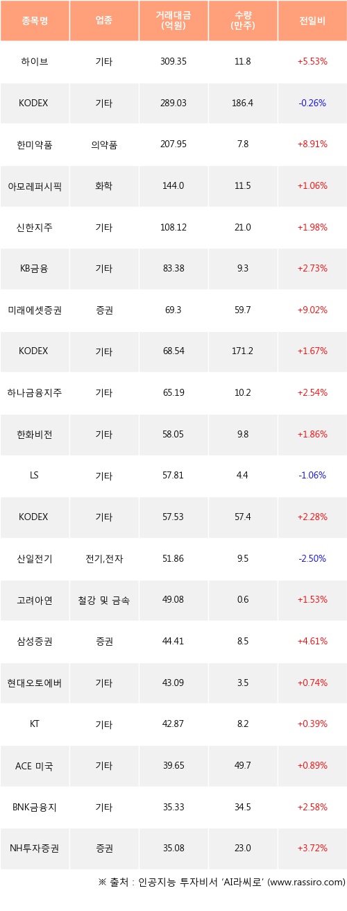 하이브, 한미약품, 아모레퍼시픽 등은 전일 대비 주가가 상승했고, KODEX 레버리지, LS, 산일전기 등은 주가가 하락했다.