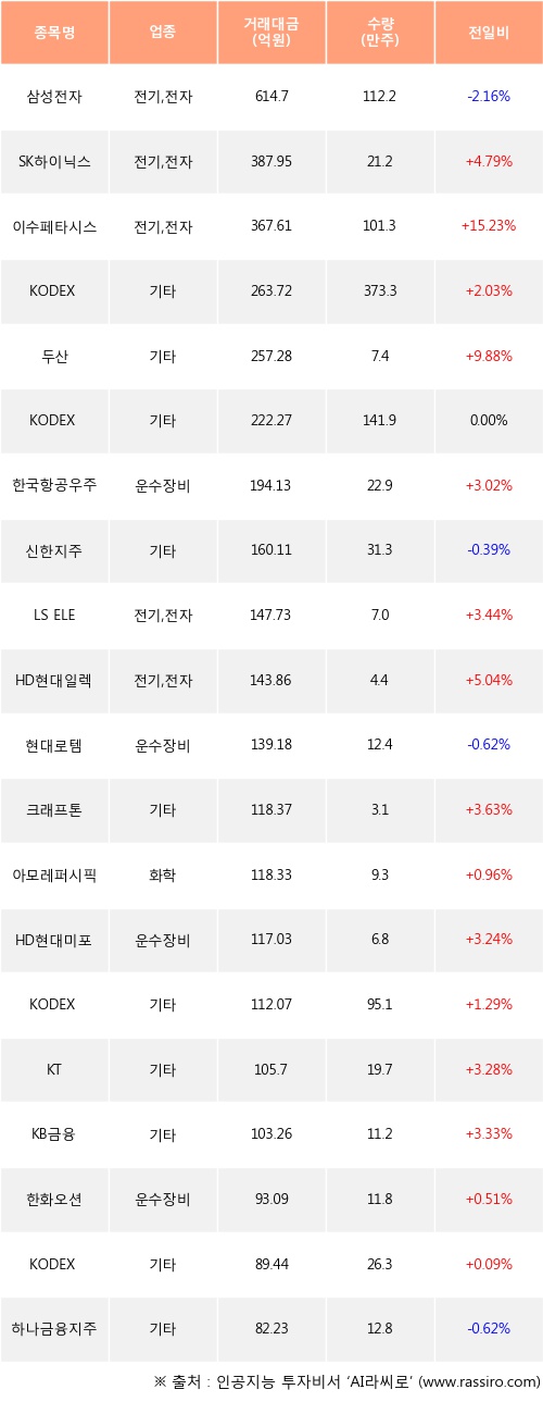 SK하이닉스, 이수페타시스, KODEX 코스닥150레버리지 등은 전일 대비 주가가 상승했고, 삼성전자, 신한지주, 현대로템 등은 주가가 하락했다.