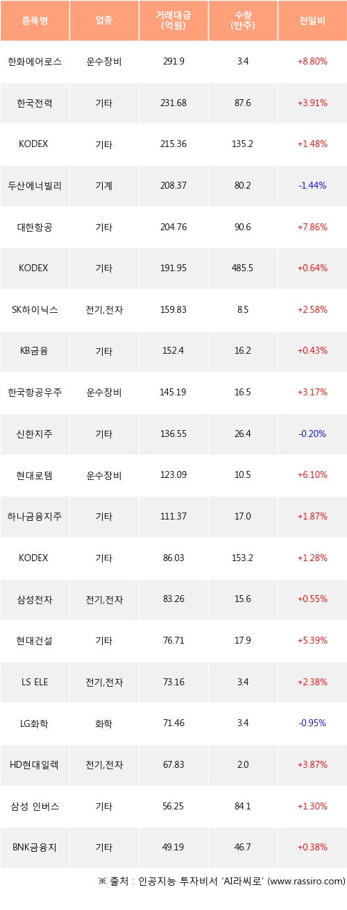 한화에어로스페이스, 한국전력, KODEX 레버리지 등은 전일 대비 주가가 상승했고, 두산에너빌리티, 신한지주, LG화학 등은 주가가 하락했다.