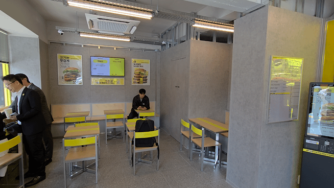 신세계푸드는 이날 서울 광진구에 콤팩트 모델 1호점인 ‘노브랜드버거 건대점’을 오픈했다. 실제 매장을 방문해보니 외관부터 기존 노브랜드 버거 매장과는 확연히 달랐다. 비용 절감을 위해 간판은 물론 브랜드 로고와 매장 내 테이블, 의자까지 노란색과 검정색 두 가지 색상만을 사용해 간결하게 꾸몄다.