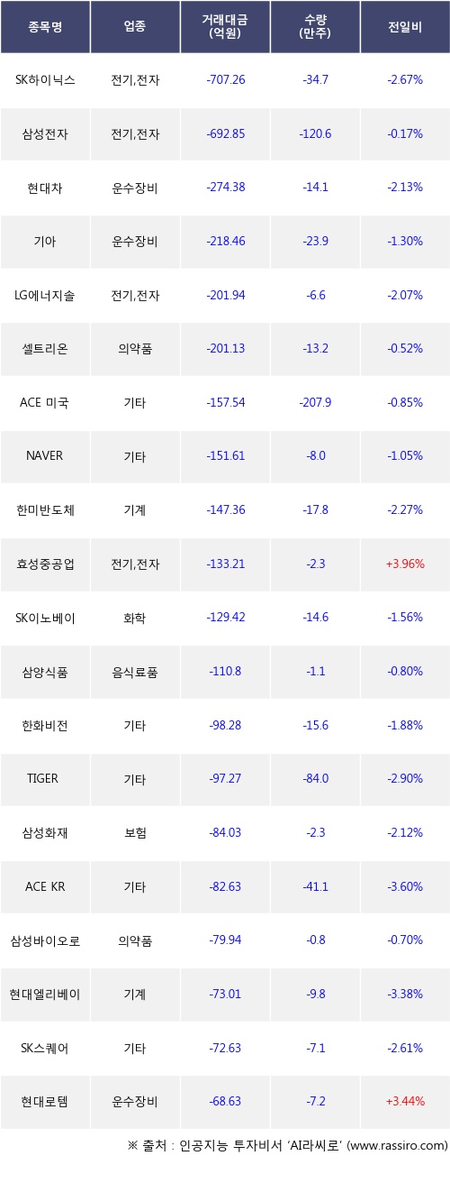 기관 투자자의 순매도 상위 20개 종목은 SK하이닉스, 삼성전자, 현대차, 기아, LG에너지솔루션, 셀트리온, ACE 미국30년국채액티브(H), NAVER, 한미반도체, 효성중공업등이다.