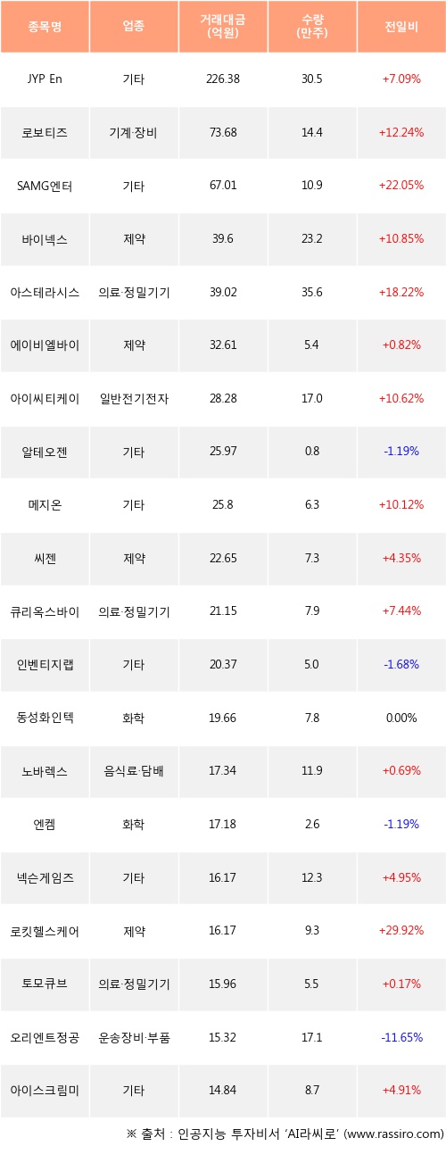 JYP Ent., 로보티즈, SAMG엔터 등은 전일 대비 주가가 상승했고, 알테오젠, 인벤티지랩, 엔켐 등은 주가가 하락했다.