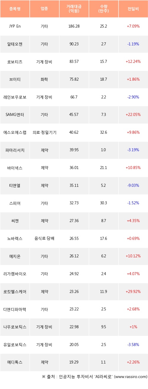 JYP Ent., 로보티즈, 브이티 등은 전일 대비 주가가 상승했고, 알테오젠, 레인보우로보틱스, 파마리서치 등은 주가가 하락했다.