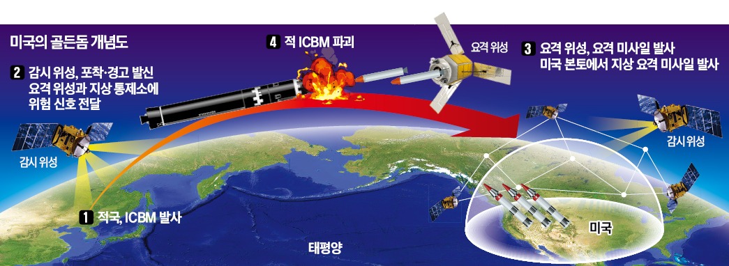 골든돔은 이스라엘의 미사일 방공체계인 아이언돔에서 착안한 미국의 차세대 미사일 방어 시스템으로 트럼프 행정부의 최우선 과제 중 하나다. 트럼프 대통령은 취임 직후인 지난 1월 27일 이 시스템을 구축하는 내용의 행정명령에 서명했고, 이번에 구체적 복안이 나온 것이다. 기존 미사일 방어체계와 비슷한 개념이지만 ‘우주 기반 요격체계’를 구축한다는 점에서 차이가 있다. 지상 레이더로 조기 탐지하기 어려운 적의 대륙간탄도미사일(ICBM) 등을 우주에서 감시 위성이 포착하고, 우주 공간에 배치된 요격 위성이 상승 단계 미사일을 타격하는 방식을 사용한다.