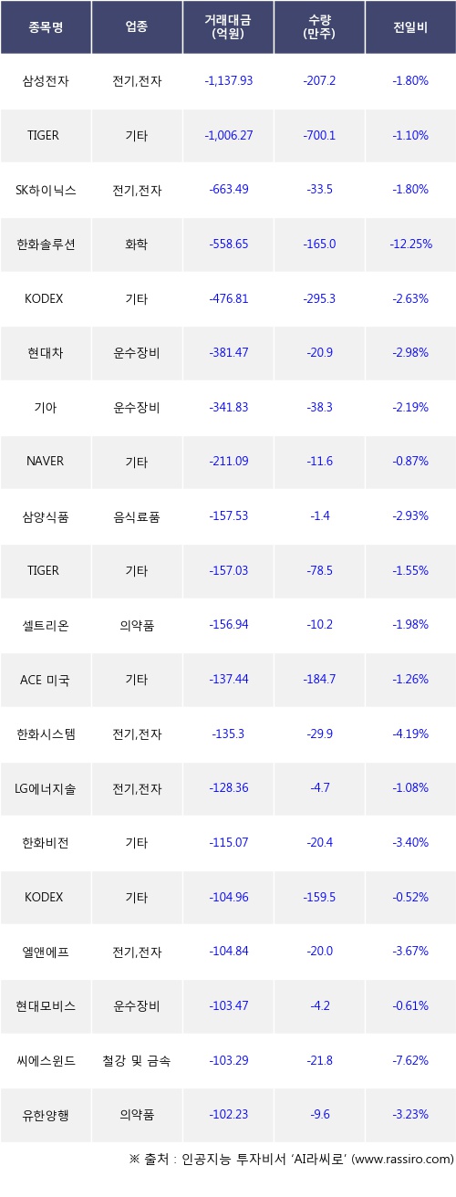 기관 투자자의 순매도 상위 20개 종목은 삼성전자, TIGER MSCI Korea TR, SK하이닉스, 한화솔루션, KODEX 레버리지, 현대차, 기아, NAVER, 삼양식품, TIGER 미국S&P500등이다.