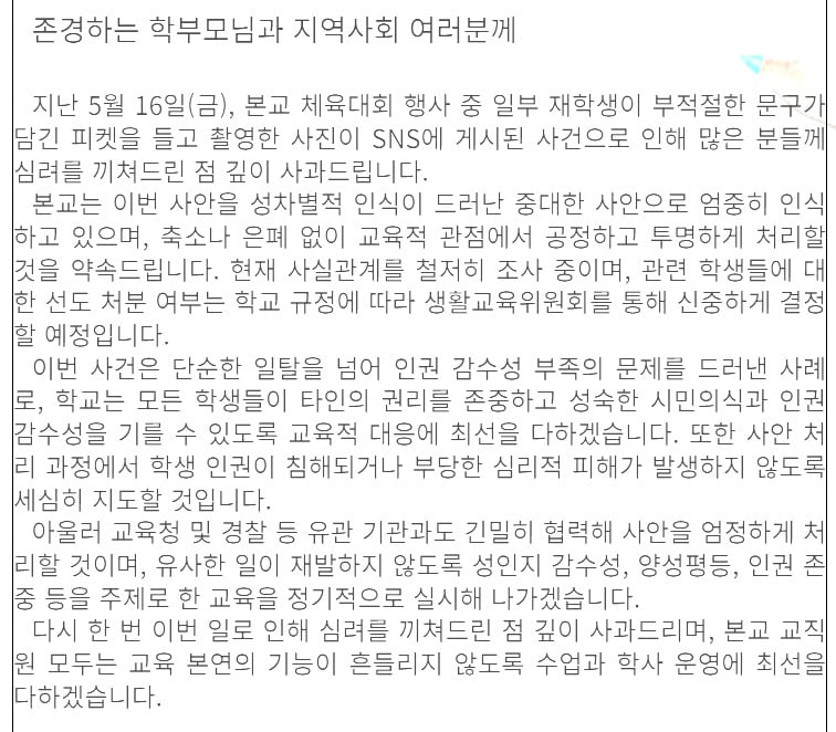 학교장은 논란 직후 공식 홈페이지를 통해 "본교 체육대회 행사 중 일부 재학생이 부적절한 문구가 담긴 피켓을 들고 촬영한 사진이 SNS에 게시된 사건으로 인해 많은 분께 심려를 끼쳐드린 점 깊이 사과드린다"며 "축소나 은폐 없이 교육적 관점에서 공정하고 투명하게 처리할 것을 약속드린다"고 밝혔다.