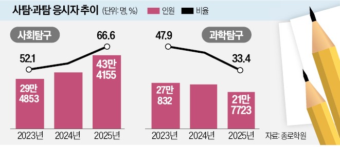 과학탐구 응시자는 21만7723명으로 전년 대비 4만4810명(17.1%) 감소했다. 과목별로는 화학I이 1만2375명 줄어 가장 큰 감소폭을 보였다. 지구과학I(1만4005명) 생명과학I(1만1878명) 등도 응시자가 크게 줄었다.