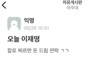 A씨는 전날(26일) 오전 10시 51분, 아주대학교 에브리타임 게시판에 "오늘 이재명 칼로 찌르면 돈 드림 ㄱㄱ(고고·GO GO)"라는 글을 올린 혐의를 받고 있다. 에브리타임은 재학·졸업 증명서 등 대학 소속 인증을 거쳐야 이용할 수 있는 커뮤니티다.