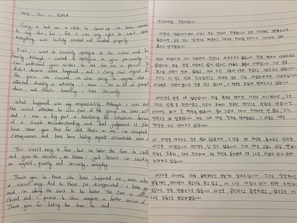 코알라는 폭행 사건에 대해 "이 일은 분명 제 책임"이라며 "처음 폭력을 행사한 사람은 아니었지만, 그는 저희 일행 중 한 명이었고, 단순한 오해와 잘못된 판단으로 상황을 악화시킨 데에는 제가 큰 역할을 했다"고 했다.