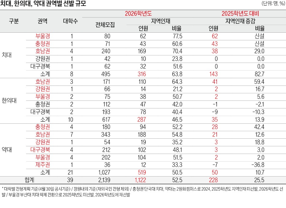 서울, 인천, 경기 소재를 제외한 지방권 의대, 치대, 한의대, 약대는 6개 권역으로 나뉘어 지역인재 전형을 실시한다. 6개 권역은 호남권(광주·전북·전남), 충청권(대전·충북·충남·세종), 대구경북권(대구·경북), 부산울산경남권(부산·울산·경남), 강원권(강원), 제주권(제주)으로 구분된다. 강원과 제주는 대학별로 최소 20% 이상을, 나머지 권역은 대학별로 최소 40% 이상을 지역인재로 선발해야 하는데, 의대의 경우 올해 이 비율이 무려 59.0%까지 늘었다. 지방권 의대는 열에 여섯은 해당 권역 학생들을 선발하겠다는 것이다.