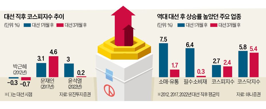 하나증권에 따르면 지난 세 번의 대선 이후 1개월간 수익률이 가장 높았던 업종은 소매·유통이었다. 평균 7.5% 상승했다. 새 정부의 경기 부양 의지가 반영됐기 때문이다. 다만 3개월 이후 상승률은 1.7%로 뚝 떨어졌다. 필수소비재 업종도 대선 직후 1개월간 평균 6.4% 뛰었다. 3개월 뒤 상승률은 평균 0.3%에 그쳤다.