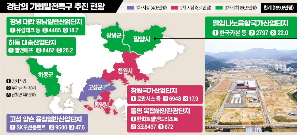 도는 지난달 말 산업통상자원부에 밀양 나노융합국가산업단지(미래 첨단소재·부품)와 창녕 대합·영남일반산업단지(미래 모빌리티 소재·부품), 하동 대송산업단지(2차전지·모빌리티 소재) 등 총 221만㎡를 기회발전특구로 추가 신청했다고 12일 발표했다.