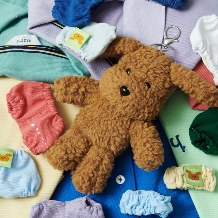 헤지스는 이번 협업을 위해 아이코닉 피케 티셔츠 중 오염, 훼손, 마감 불량, 변색 등으로 정상 판매하기 어려운 재고 상품 수백 장을 선별했다. 재고는 해체 및 재구성 과정을 거쳐 강아지 키링 전용 ‘탱크탑’과 ‘호박 팬츠’ 형태의 미니 의류로 재탄생했다.