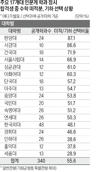 종로학원이 연세대, 성균관대, 서강대, 한양대, 중앙대, 경희대, 이화여대, 한국외대, 서울시립대, 건국대, 홍익대, 숙명여대, 국민대, 세종대, 단국대, 아주대, 인하대 등 주요 17개 대학의 ‘어디가’ 발표 2025학년도 정시 입시 결과를 분석한 결과, 이들 대학의 인문계 학과 합격생 중 이과생은 평균 55.6%에 달하는 것으로 나타났다. 인문계 학과 합격생의 절반 넘는 인원이 수학 기준 미적분, 기하를 선택한 이과 학생이었다는 것이다.