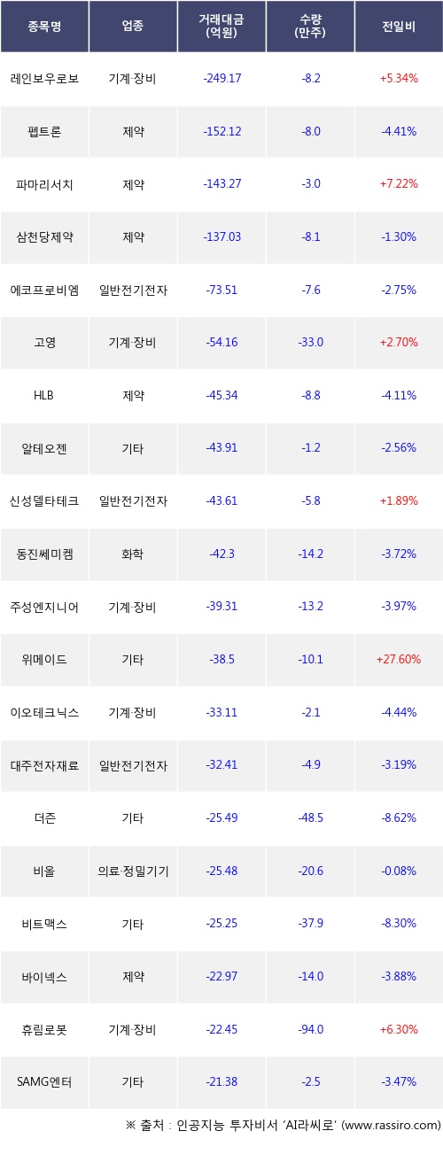 외국인 투자자의 순매도 상위 20개 종목은 레인보우로보틱스, 펩트론, 파마리서치, 삼천당제약, 에코프로비엠, 고영, HLB, 알테오젠, 신성델타테크, 동진쎄미켐등이다.