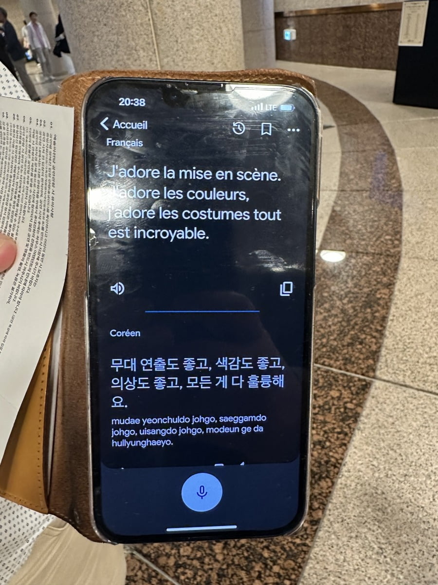 로비에서 만난 파리국립고등음악원 교수, 호르니스트 자크 들르플랑크(62)는 한국에서 경험한 프랑스어 오페라에 대해 "무대 연출도 좋고, 색감도 좋고, 의상도 좋고, 모든 게 다 훌륭했다"며 찬사를 보냈다.