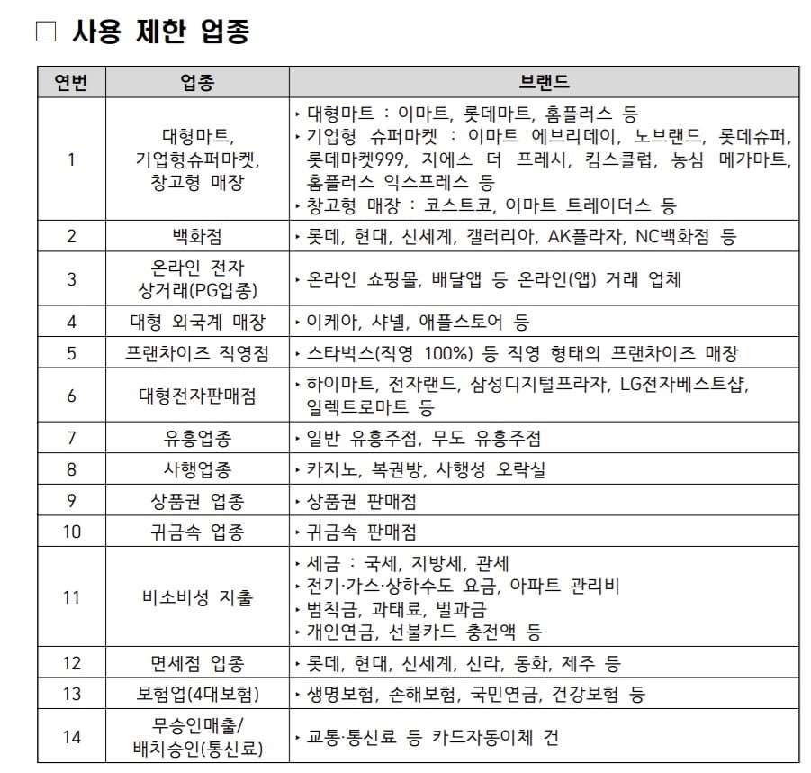이케아, 샤넬, 애플스토어 대형 외국계 매장도 불가능하다. 스타벅스(직영 100%) 등 직영 형태의 프랜차이즈 매장도 안된다. 하이마트, 전자랜드, 삼성디지털프라자, LG전자 베스트샵, 일렉트로마트 등 가전 매장도 안된다. 일반 유흥주점, 무도 유흥주점도 사용이 불가능하다. 카지노, 복권방, 사행성 오락실,?귀금속 판매점도 사용을 막았다. 국세, 지방세, 관세 ?전기·가스·상하수도 요금으로도 쓸 수 없다. 아파트 관리비 ?범칙금, 과태료, 벌과금 ?개인연금, 선불카드 충전액 등으로도 사용할 수 없다. 롯데, 현대, 신세계, 신라, 동화, 제주 등 면세점도 불가능하다. ?생명보험, 손해보험, 국민연금, 건강보험 등으로도 사용이 불가능하다."