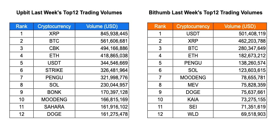 업비트의 주간 거래량은 유동성이 높은 토큰에 집중되어 있었으며, XRP가 8억 4590만 달러로 1위를 차지했고, BTC가 5억 6160만 달러, CBK가 4억 9420만 달러로 뒤를 이었습니다. 특히 CBK의 거래량이 눈에 띄게 급증했습니다. ETH와 USDT는 각각 4억 1890만 달러와 3억 4450만 달러로 꾸준한 거래량을 기록한 반면, STRIKE와 PENGU는 3억 2천만 달러 안팎으로 거의 동일한 거래량을 기록하며 신흥 자산 또는 트렌드 주도 자산에 대한 관심이 높아지고 있음을 시사했습니다. 상위 12개 토큰 중 MOODENG, SAHARA, BONK가 포함된 것은 투기성 토큰과 커뮤니티 주도 토큰으로의 전환을 더욱 잘 보여주며, 각 토큰의 주간 거래량은 1억 6000만 달러를 넘어섰습니다. 주요 토큰들이 존재함에도 불구하고, 전반적인 분포는 한국 개인 투자자들의 다양한 수요를 보여줍니다.