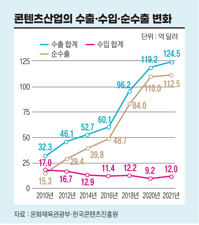 2022년에는 K콘텐츠 산업의 수출액과 매출액 모두 역대 최대치를 기록했다. 문화체육관광부에 따르면 콘텐츠 산업 수출액은 2005년 13억113만 달러에서 2015년 56억6137만 달러, 2023년 133억3941만 달러로 급증했다.