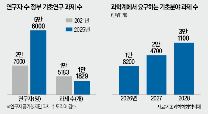 이들은 “연구실을 지키고 있어야 할 기초과학 연구자들이 이 자리에 선 것은 연구실이 사라지고 있기 때문”이라며 “2021년도부터 2025년도까지 연구자가 2만7000명에서 5만6000명 이상으로 두 배 넘게 증가했지만 과제 수는 약 1만5000개에서 1만1000개로 줄었다”고 호소했다. 기초연구 과제 수 대폭 감소로 고사 위기에 처했다는 것이다. 실제 정부의 기초연구사업 과제 수는 2021년 1만5183개에서 2023년 1만4912개, 올해는 1만1829개로 쪼그라들었다. 출연연 관계자는 “신규 및 계속 총과제가 2026년 1만8200개, 2027년 2만4700개, 2028년 3만1100개로 늘어나야 한다”며 “향후 3년간 매년 최소 6400개 수준의 과제 수 증가가 필요하다”고 강조했다.
