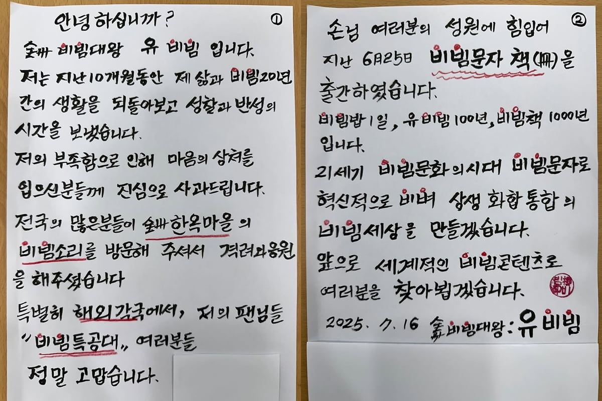 넷플릭스 '흑백요리사'에 참가해 유명세를 탔던 '비빔대왕' 유비빔이 불법 영업 자백 후 근황을 전했다.유비빔은 지난 16일 자신의 소셜미디어 계정에 "지난 10개월 동안 제 삶과 비빔 20년간의 생활을 되돌아보고 성찰과 반성의 시간을 보냈다"며 "제 부족함으로 인해 마음의 상처를 입으신 분들께 진심으로 사과드린다"는 내용의 자필 편지를 공개했다.