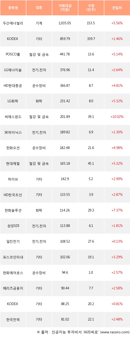 기관 투자자의 순매수 상위 20개 종목은 두산에너빌리티, KODEX 레버리지, POSCO홀딩스, LG에너지솔루션, HD현대중공업, LG화학, 씨에스윈드, SK하이닉스, 한화오션, 현대제철등이다.