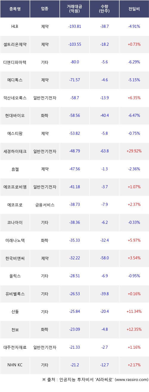 외국인 투자자의 순매도 상위 20개 종목은 HLB, 셀트리온제약, 디앤디파마텍, 메디톡스, 덕산네오룩스, 현대바이오, 에스티팜, 세경하이테크, 휴젤, 에코프로비엠등이다.