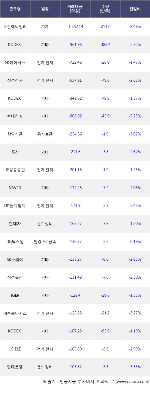 이날 기관 투자자가 순매도한 종목들 중에 두산에너빌리티, KODEX 레버리지, SK하이닉스 등은 전일 대비 주가가 하락했다.