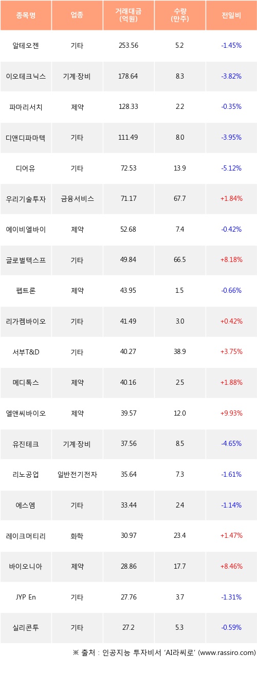 우리기술투자, 글로벌텍스프리, 리가켐바이오 등은 전일 대비 주가가 상승했고, 알테오젠, 이오테크닉스, 파마리서치 등은 주가가 하락했다.