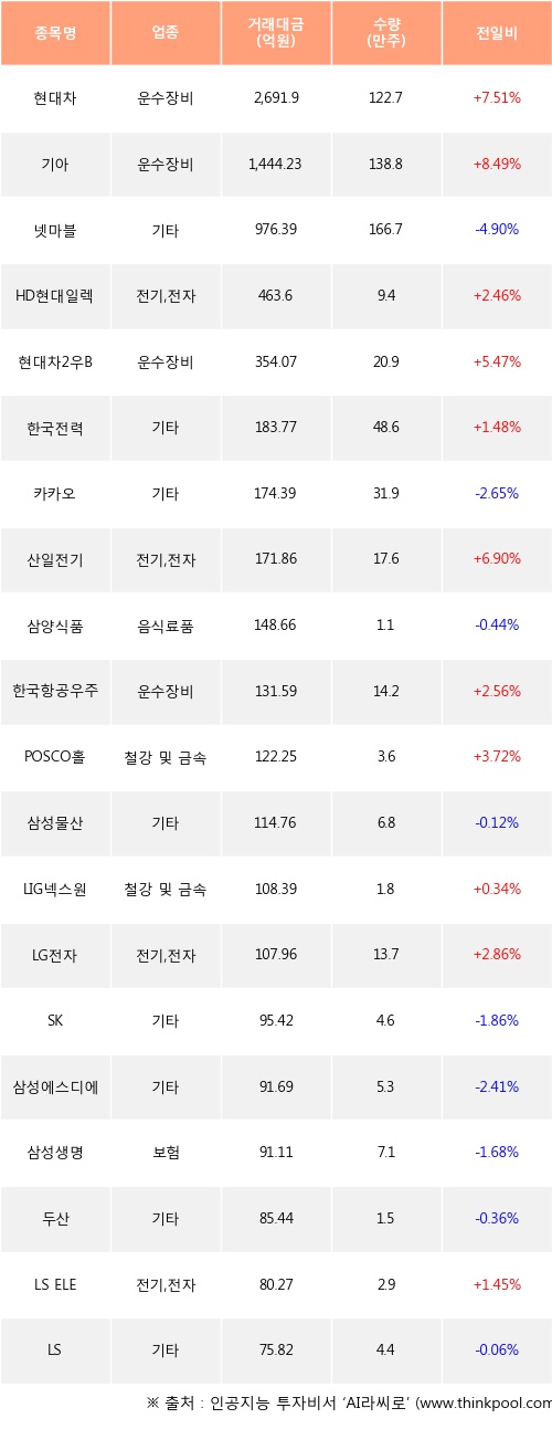 외국인 투자자의 순매수 상위 20개 종목은 현대차, 기아, 넷마블, HD현대일렉트릭, 현대차2우B, 한국전력, 카카오, 산일전기, 삼양식품, 한국항공우주등이다.