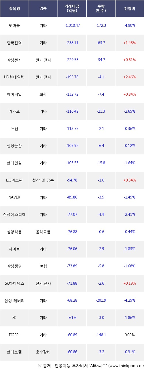 기관 투자자의 순매도 상위 20개 종목은 넷마블, 한국전력, 삼성전자, HD현대일렉트릭, 에이피알, 카카오, 두산, 삼성물산, 현대건설, LIG넥스원등이다.