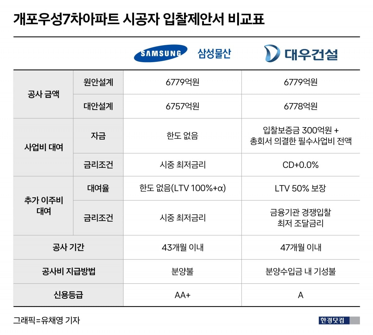 서울 강남구 '개포우성7차' 재건축 도시정비사업의 입찰 제안서가 공개됐다. 시공사 선정을 한 달가량 앞두고 수주전에 뛰어든 삼성물산과 대우건설이 조합원 표심 잡기를 위해 내세운 '회심의 카드'에 관심이 쏠린다.