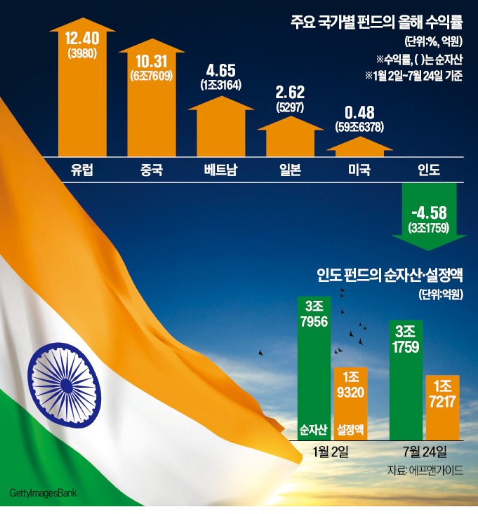 금융정보업체 에프앤가이드에 따르면 국내 투자자가 가입한 인도 펀드의 올해 수익률은 -4.58%로, 주요 국가별 펀드 중 가장 낮았다. 이 기간 일제히 플러스를 기록한 유럽 펀드(12.4%), 중국 펀드(10.31%), 베트남 펀드(4.65%), 일본 펀드(2.62%), 미국 펀드(0.48%) 등 다른 주요국 펀드와 대비되는 성적표다. 인도 펀드 설정액은 전날 기준 1조7217억원으로, 올해 들어서만 2103억원 감소했다. 주요 국가별 펀드 가운데 설정액이 가장 많이 줄었다.
