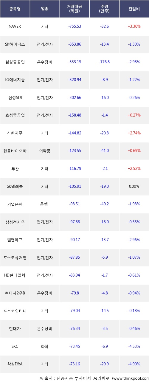 외국인 투자자의 순매도 상위 20개 종목은 NAVER, SK하이닉스, 삼성중공업, LG에너지솔루션, 삼성SDI, 효성중공업, 신한지주, 한올바이오파마, 두산, SK텔레콤등이다.
